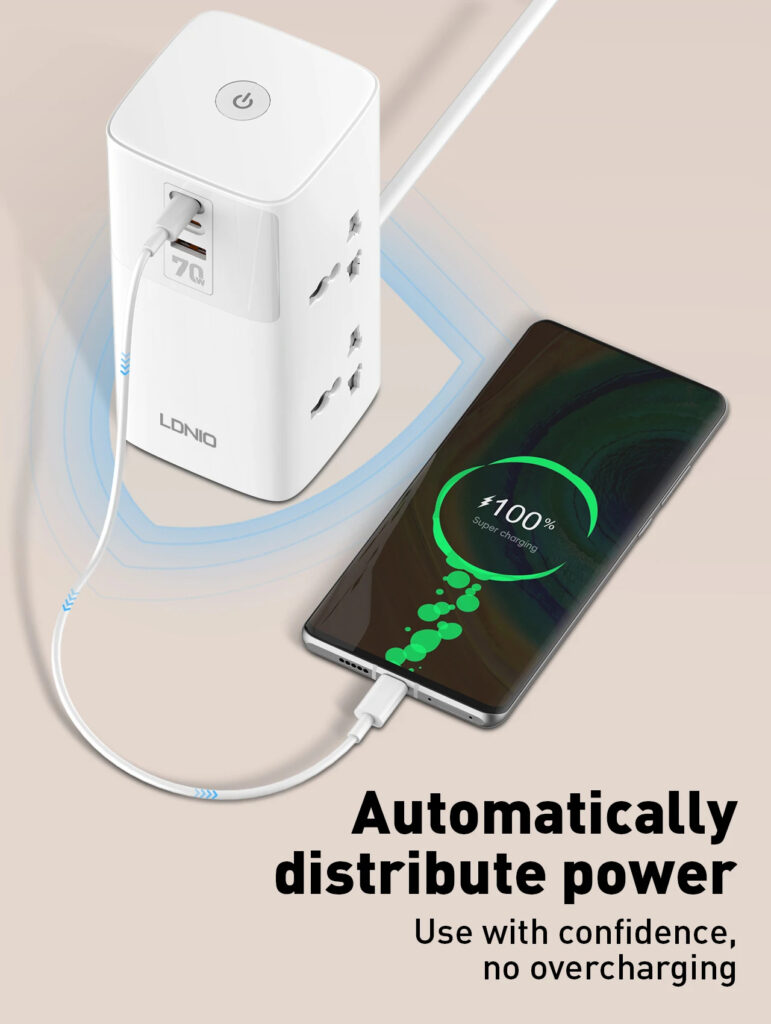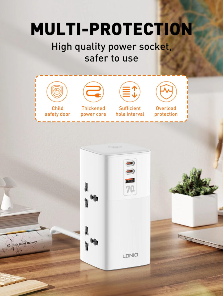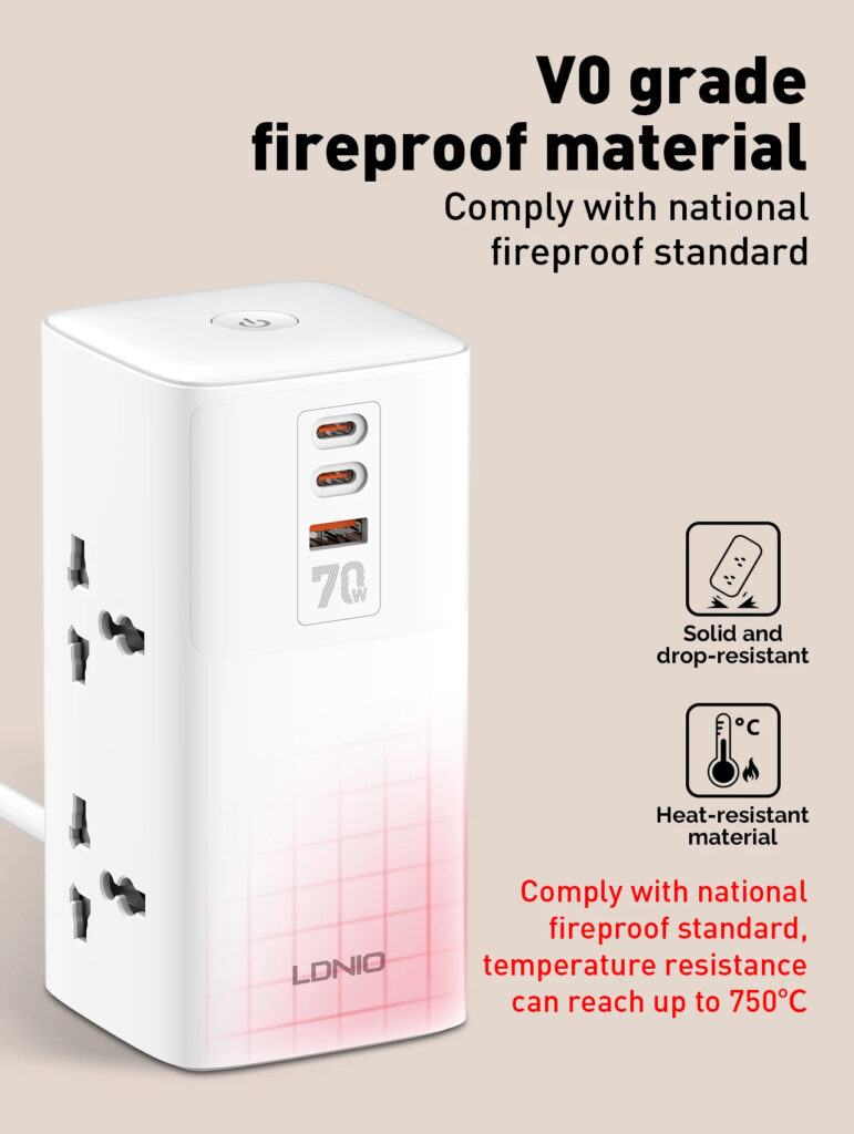 Features: 1. 70W Super Fast Charging: Capable of directly charging laptops via USB ports with PD/PPS/SCP/QC3.0 technologies. 2. 4 Universal Outlets: Accommodates various types of adapters, providing flexibility in power management. 3. GaN Technology with LDNIO Turbo Power Engine: Enables a smaller, lighter, and faster charging solution. 4. V0 Grade Fireproof Material: Constructed with national standard fireproof material that withstands temperatures up to 750°C. 5. High-Quality Copper: Utilizes precise welding technology for better conductivity and reliability.